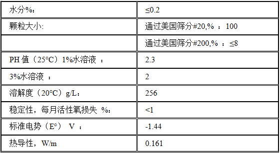 物理性狀:呈可以自由流動(dòng)的白色粉狀固體,易溶于水, 在20℃(68OF)時(shí),水溶解度大于250g/L。堆積密度1.1-1.2。